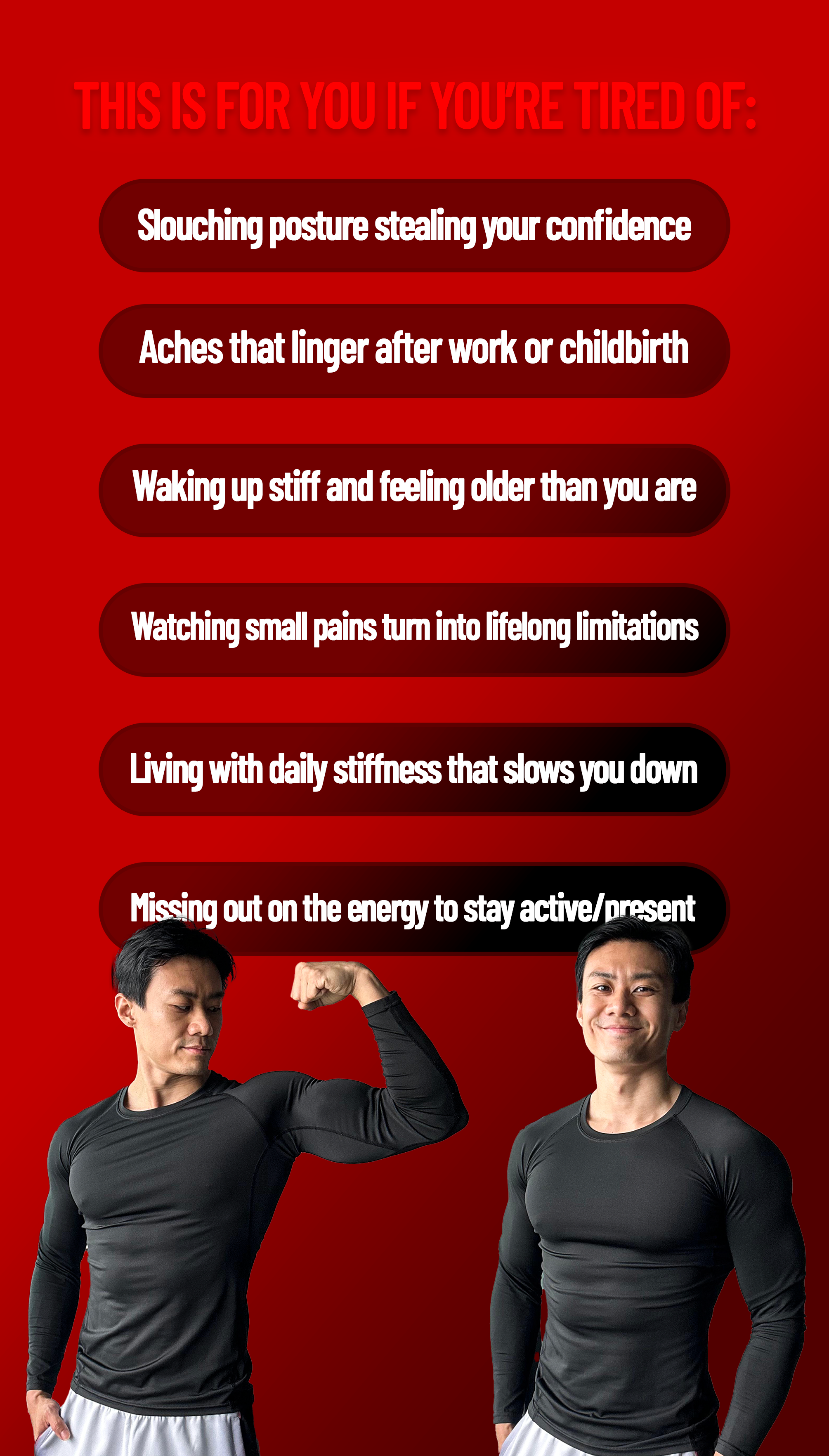 Start before it's too late/irreversible. These stretches are gentle and proven to reduce pain, improve posture, and rebuild mobility (even if you’ve been stiff for a long time). Thousands of people in their 40s, 50s, and beyond have seen massive results.